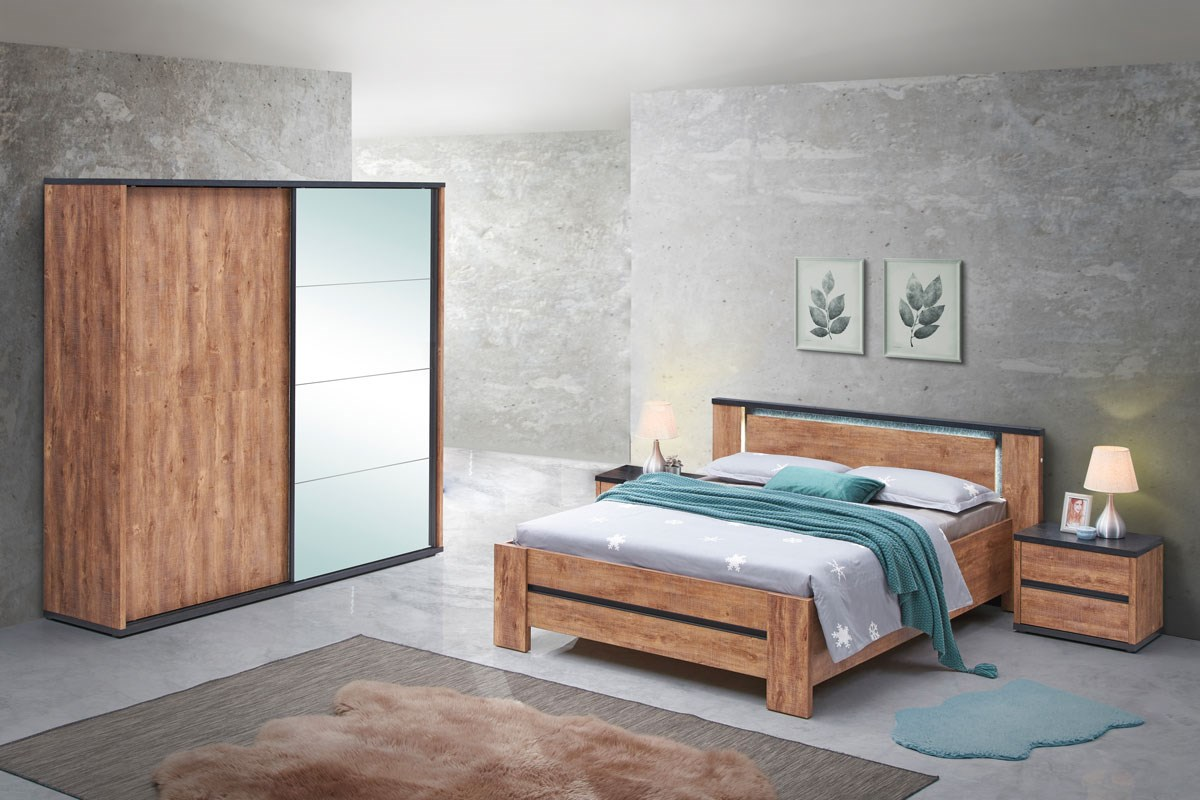 Slaapkamer ELSA is een stijlvolle collectie met praktische opbergmeubelen. Deze collectie is afgewerkt in industrieel eikenhout met zwarte details. Het tweepersoonsbed is voorzien van sfeervolle ledverlichting.