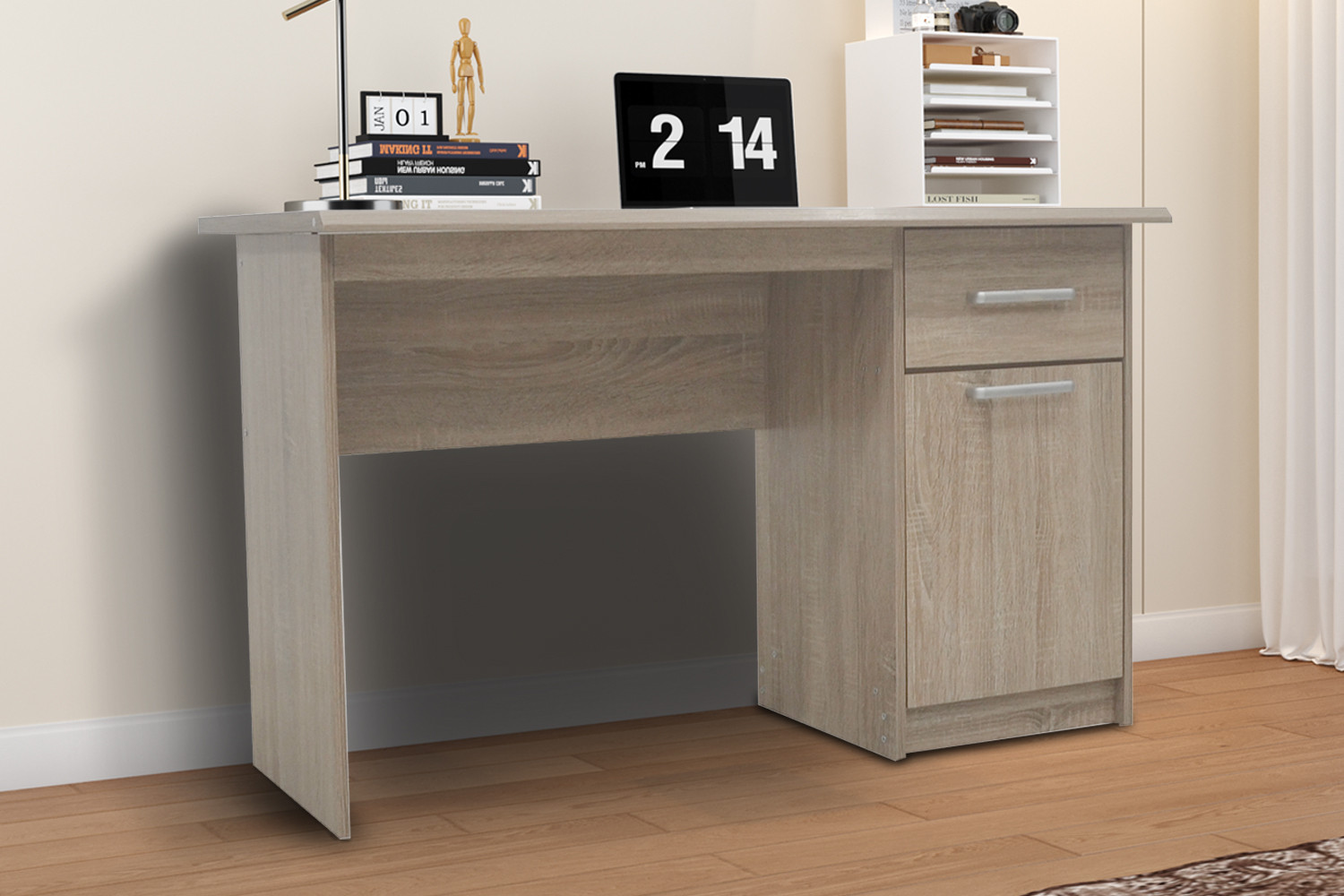 MILOU bureau. De elegante structuur van MDF-materiaal in de kleur Sonoma geeft een frisse toets aan de werkomgeving. De draaideur verbergt de planken op een slimme manier voor optimale opbergruimte, terwijl de lade extra ruimte biedt voor documenten en kantoorbenodigdheden.