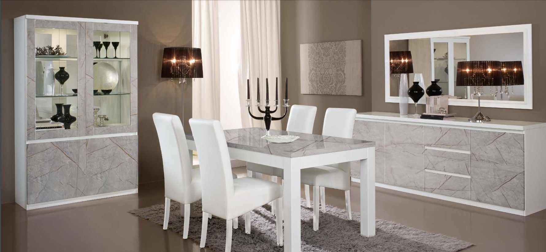 Spiegel 140 of 180 cm, vitrinekast met 1 deur van 58 cm, dressoir met 2 deuren en 3 lades van 165 cm, tv-meubel 150 of 220 cm, salontafel 127 cm
