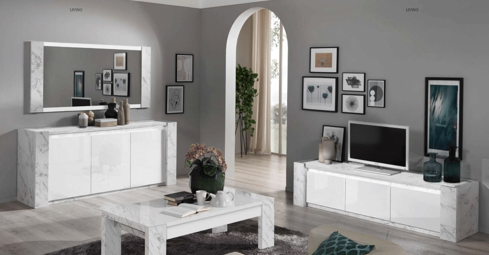 Charmante, gezellige woonkamer VITTORIA in witte hoogglans gecombineerd met een gemarmerd wit decor. De meubelen zijn heel modern!