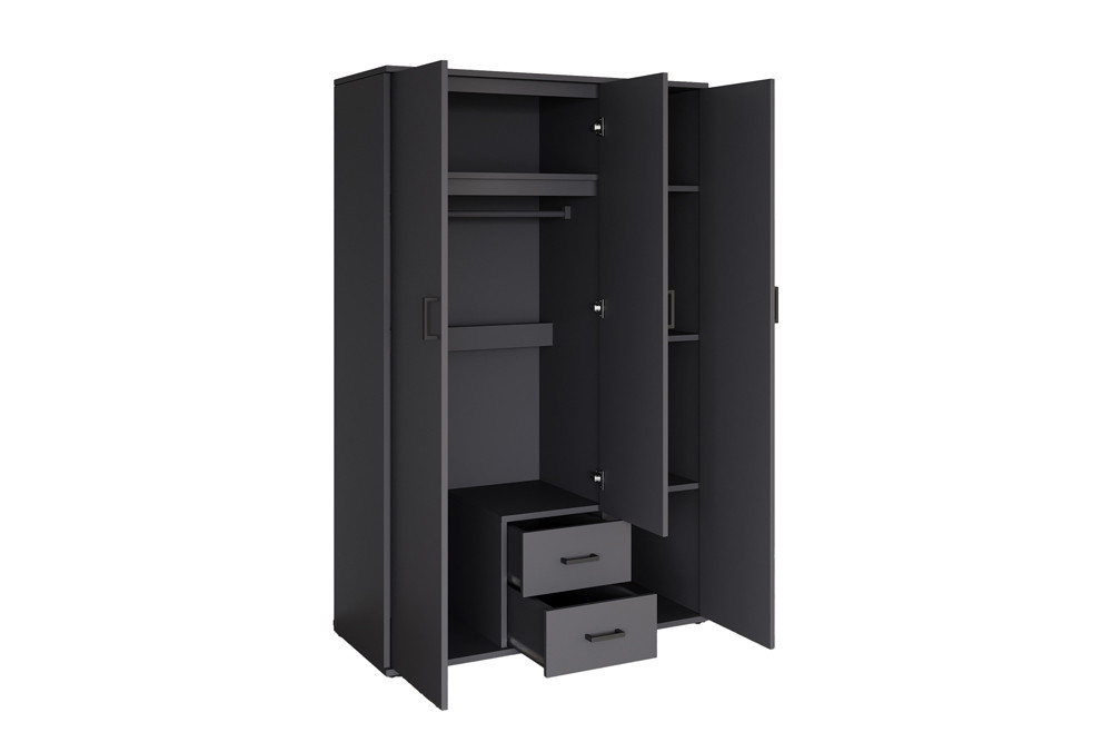 Handige en simpele 3 deurs kledingkast met hangbaar, legplanken, 2 lade en spiegel op één deur.