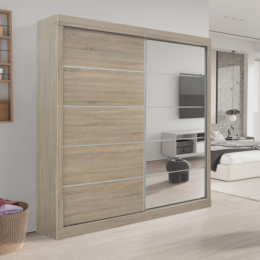 Geniet van functionele en stijlvolle opbergruimte met de schuifdeurkast met spiegel uit de Mike-collectie. Met zijn schuifdeuren en spiegel biedt dit meubel volop opbergruimte.