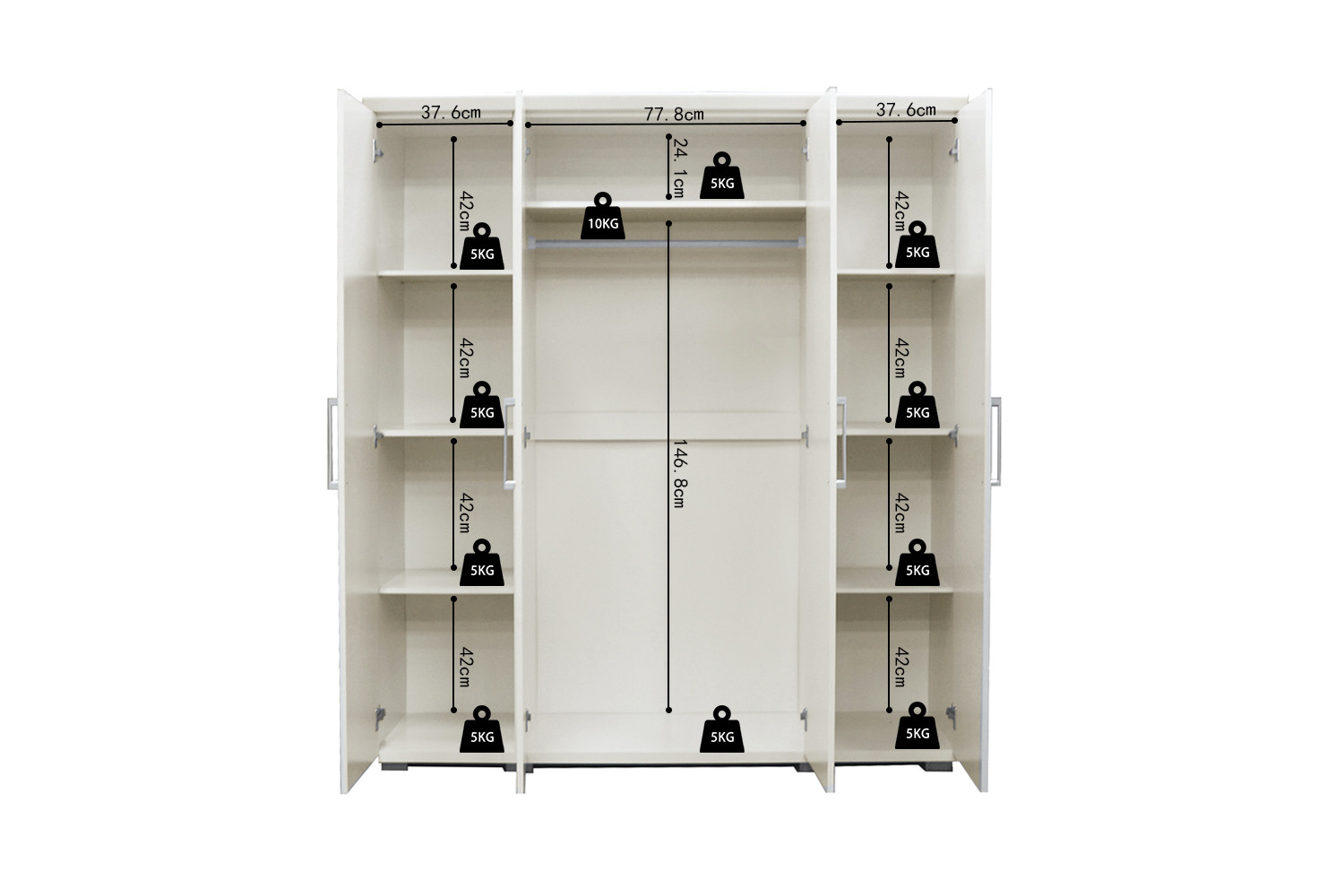 Kast MIKE past dankzij de Wit kleur en het modern design in heel wat interieurs! De kast is uitgerust met 4 deuren met daarachter 7 legplanken en 1 garderobestang. Kast MIKE is gemaakt van kwalitatieve spaanplaat.