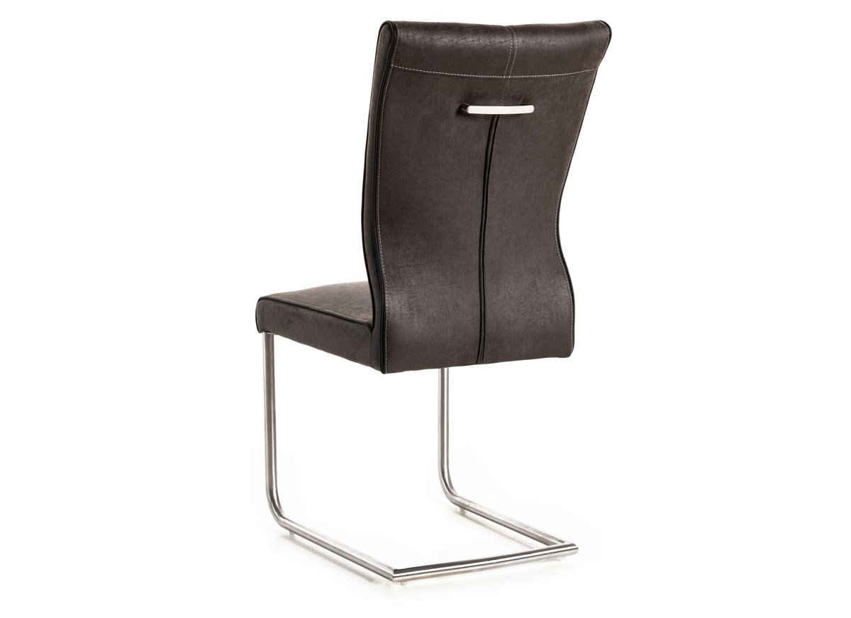 Elegante eetkamerstoel met een verchroomd sledeframe en stoffen bekleding. Voorzien van een praktische handgreep aan de achterkant.