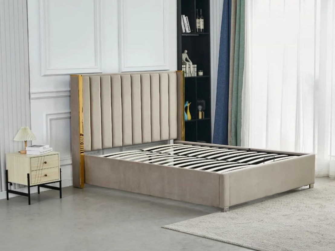 Dit bed valt op door het elegante ontwerp en de zachte bekleding, en geeft je slaapkamer een moderne en stijlvolle uitstraling.