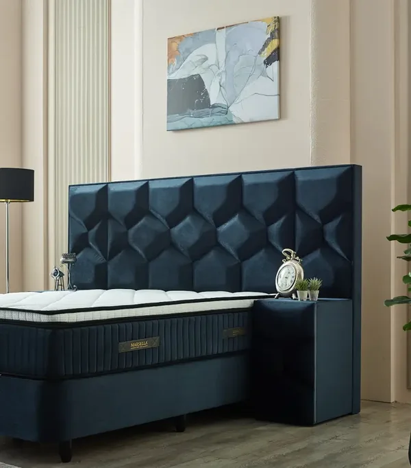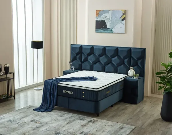 NOVANO: Modern design met geometrisch gestikt hoofdbord en stijlvolle donkerblauwe stof. Biedt ultiem comfort én extra opbergruimte.