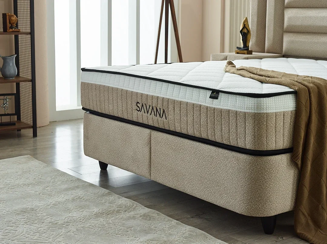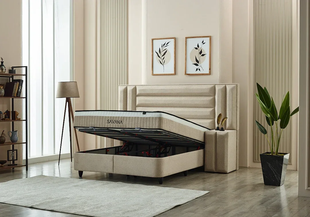 Deze SAVANA set, in beige tinten, met een gestoffeerd en stijlvol hoofdbord en geïntegreerde nachtkastjes, straalt een elegante en rustgevende sfeer uit dankzij de natuurlijke decoratieve elementen.