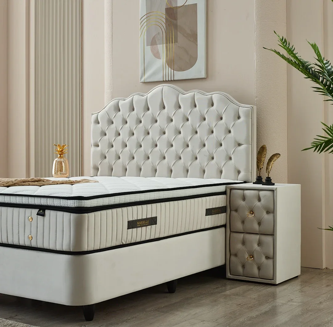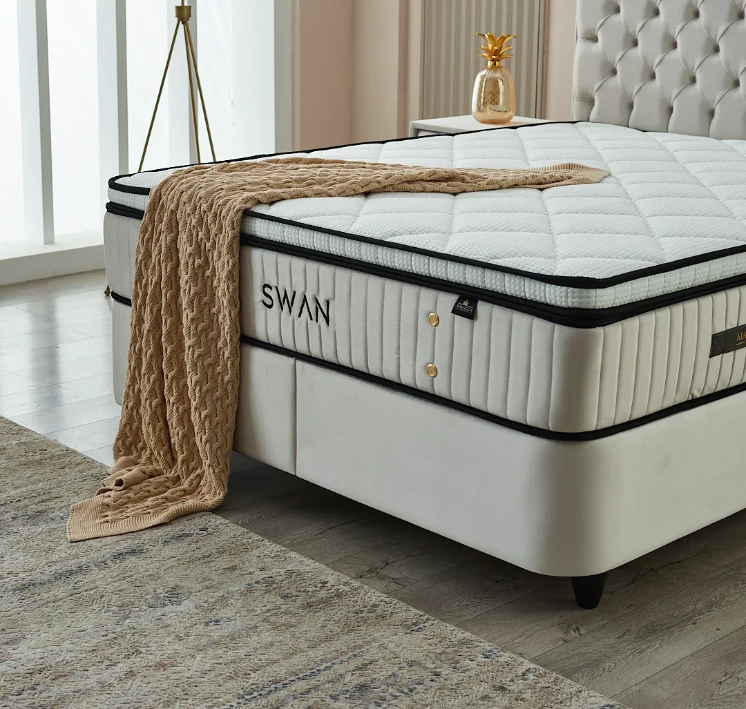 Deze luxueuze SWAN boxspring combineert klassieke elegantie met functionaliteit dankzij het hoge, gebogen en gecapitonneerde (geknopte) hoofdbord, het bijpassende nachtkastje met twee lades en de poef met opbergruimte aan het voeteneinde.