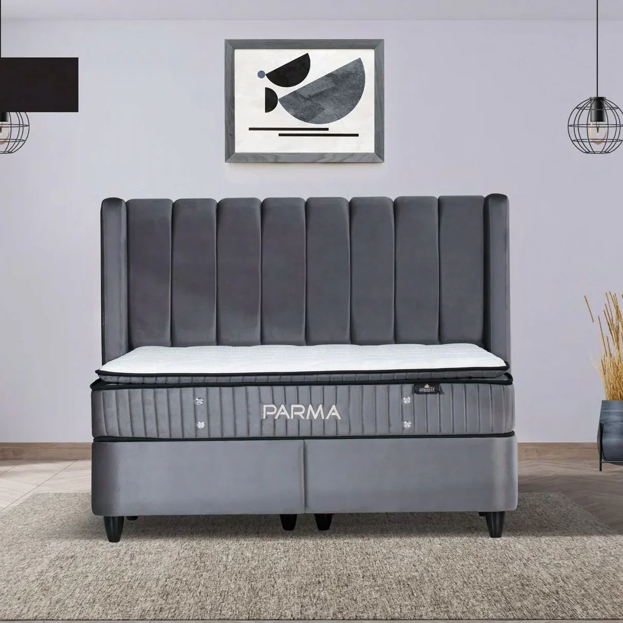Dit PARMA bed combineert moderne elegantie met een hoog en gevleugeld donkergrijze fluwelen hoofdbord dat is voorzien van een verticaal geribbeld (gecanneleerd) ontwerp en een eenvoudige boxspring.