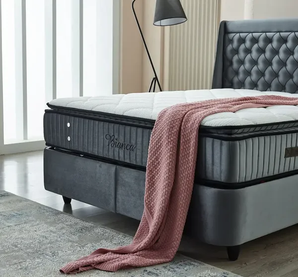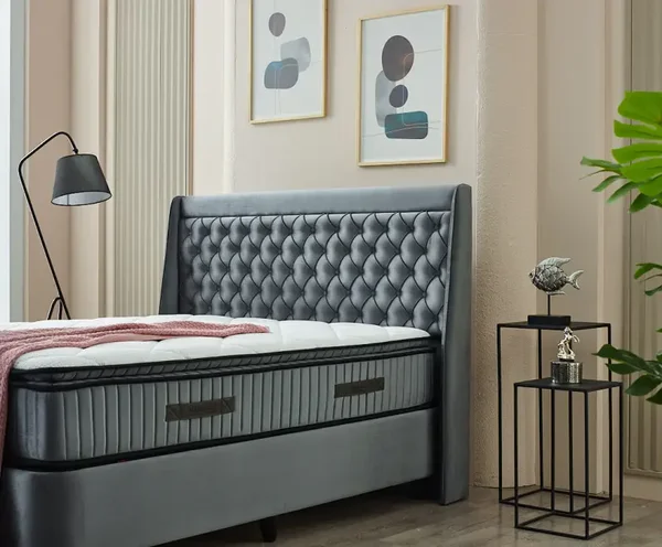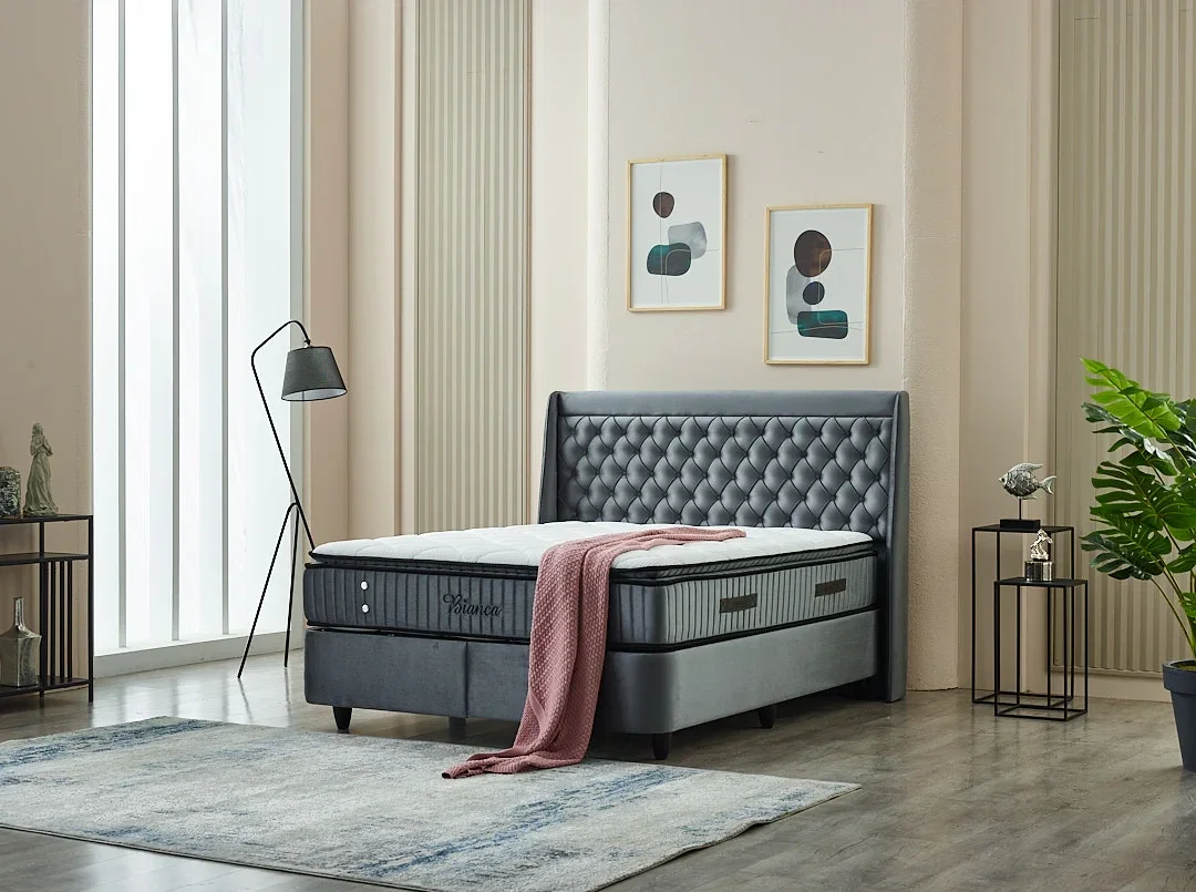 Dit moderne BIANCA bed combineert een eenvoudige boxspring met een donkergrijze fluwelen stof en een hoog gevleugeld hoofdbord dat is voorzien van een geknopt (gecapitonneerd) ontwerp voor een luxe uitstraling.