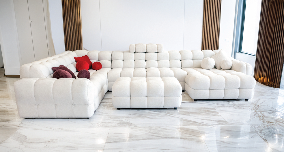 Deze ruime en modulaire hoekzetel combineert luxe en comfort. Het wolkvormige ontwerp en de zachte teddy stof zorgen voor zowel esthetiek als gezelligheid. Dankzij de flexibel samenstelbare modules is deze zetel ideaal voor grote leefruimtes. Verkrijgbaar in verschillende kleuren.