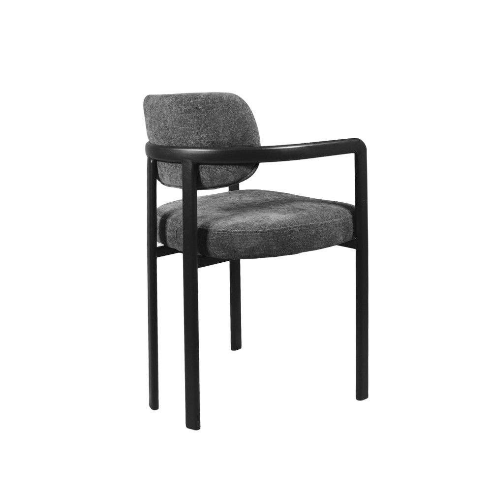 Deze eetkamerstoel combineert een elegante stoffen bekleding met een stevig, gepoedercoat metalen onderstel, wat zowel duurzaamheid als een moderne uitstraling biedt.