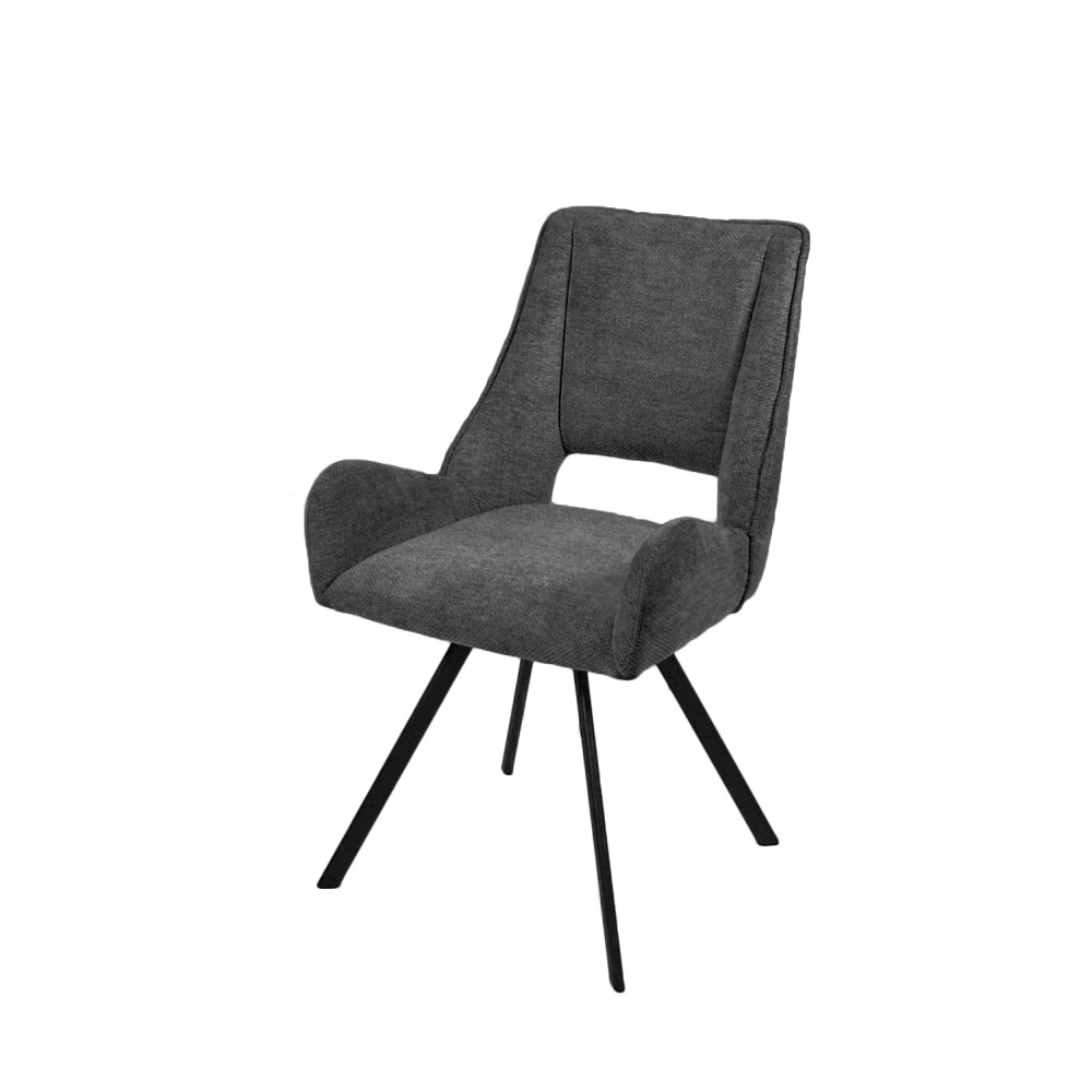 Een comfortabele eetkamerstoel van stof met licht brede armleuningen. De open rugleuning en zwarte metalen poten maken hem perfect voor elke woonkamer.