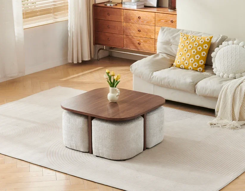 Een stijlvolle salontafel en verborgen poefset in één! De perfecte oplossing voor kleine ruimtes, waarbij moderne houtstructuren worden gecombineerd met comfortabele zitplaatsen.